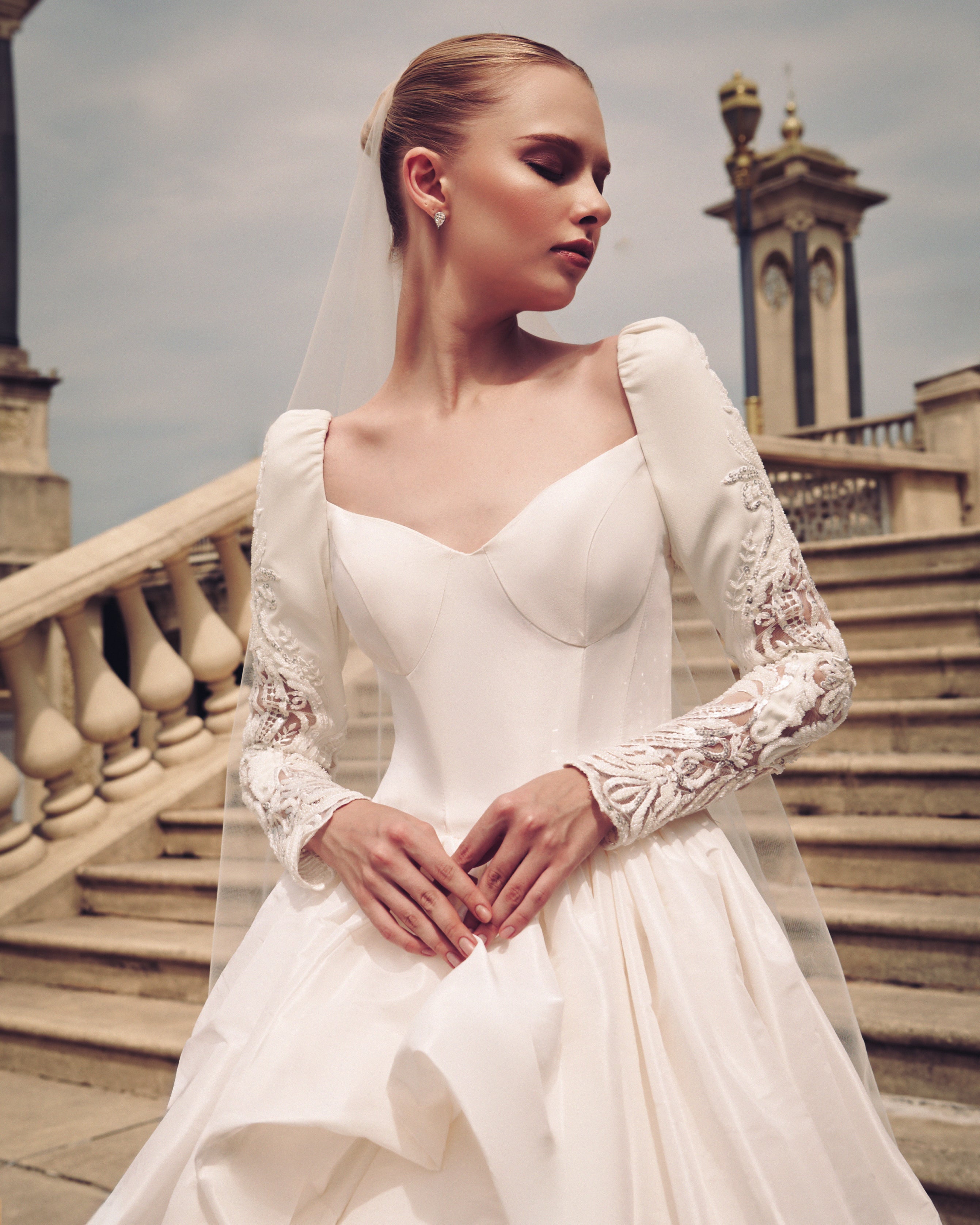 An ivory gown is the perfect testament to new beginnings, for something so austere to be masterfully crafted into the very image of romantic elegance. The clean bodice is beautifully framed by laced and beaded sleeves before resting on a dramatic and voluminous skirt, makes for a picture perfect moment.