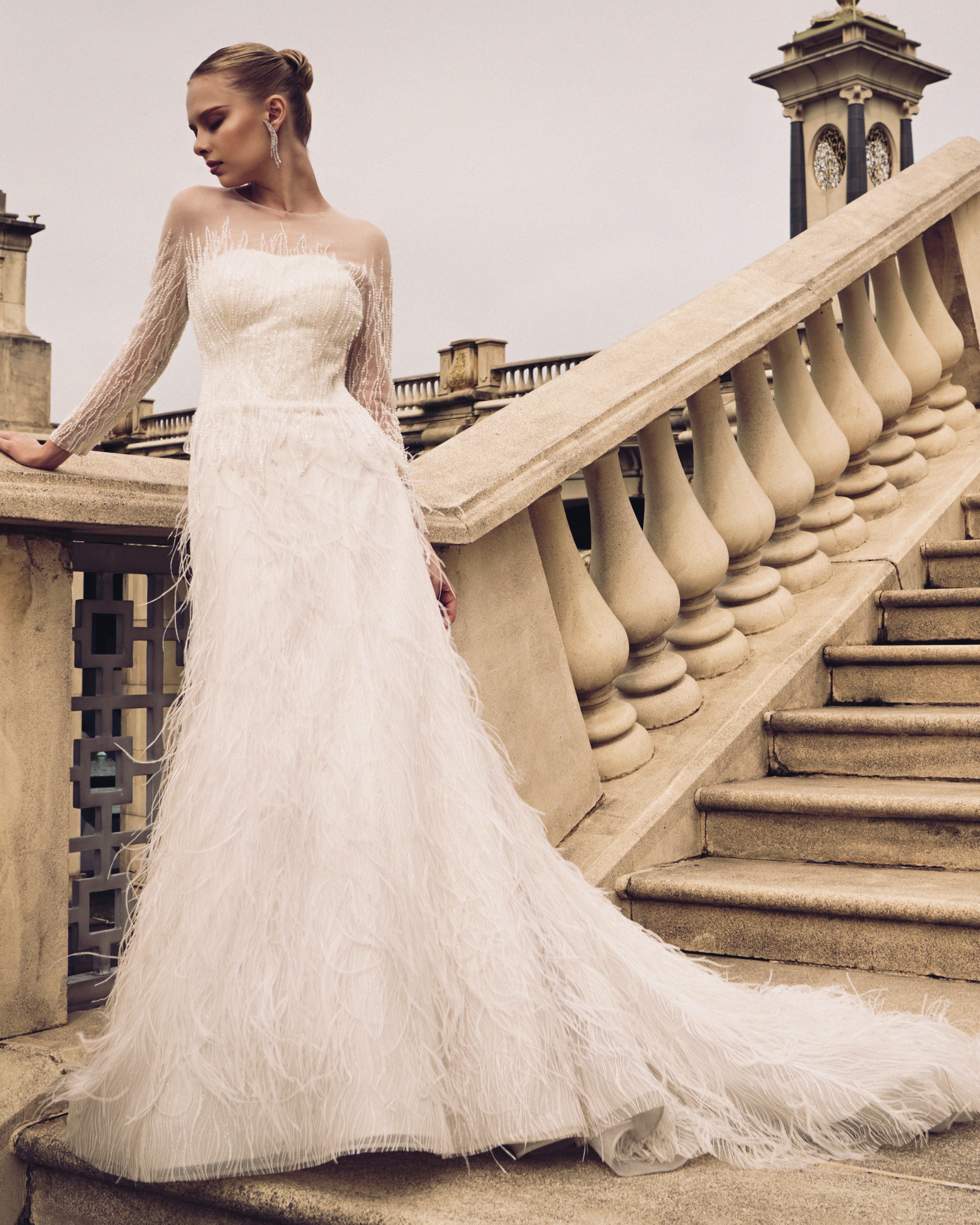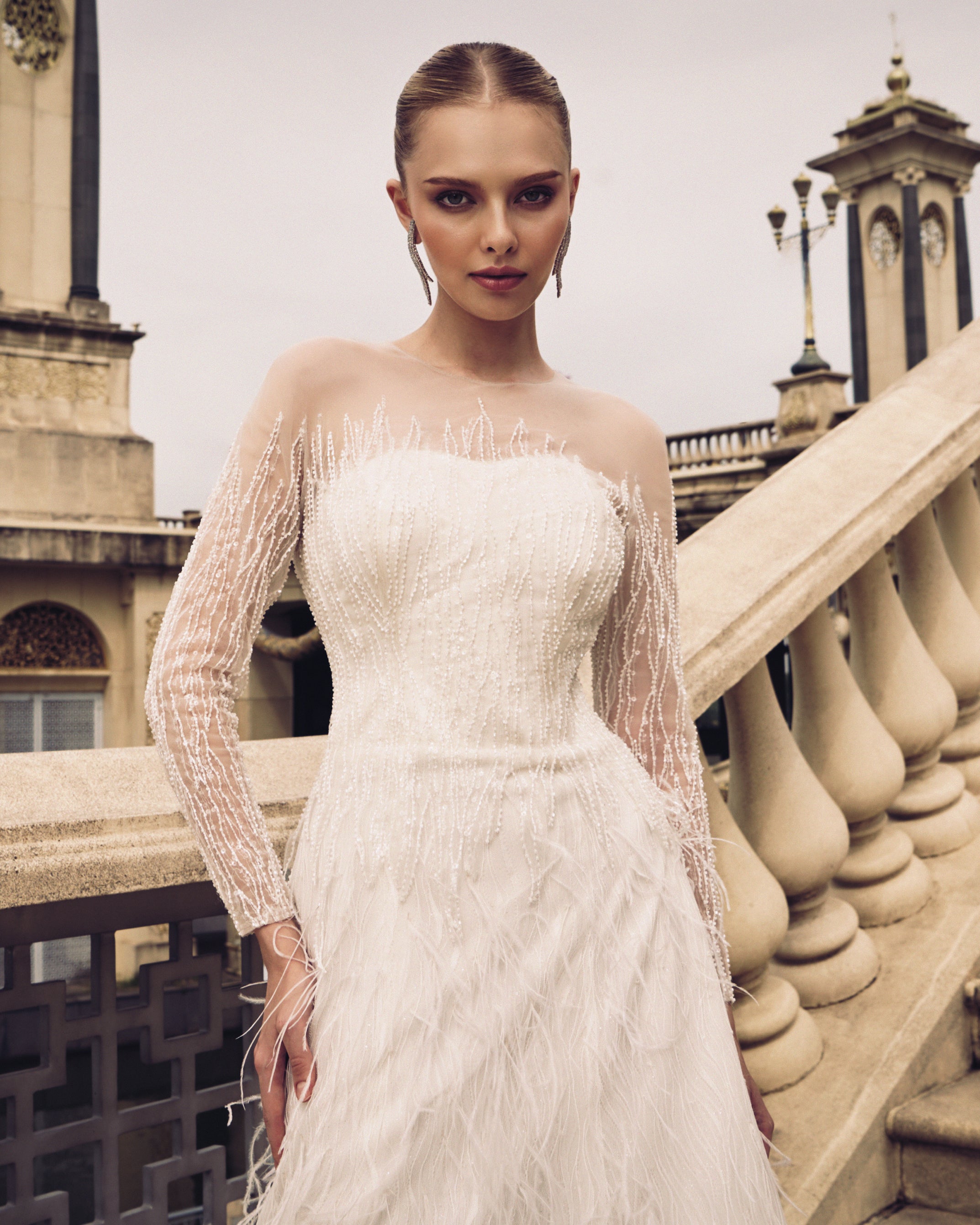 The feathered floor-sweeping skirt on this gown wisps delicately with every movement. A spectacle in pristine white, it is carefully crafted to follow through from the design language of the beaded bodice, making for a charming ensemble.