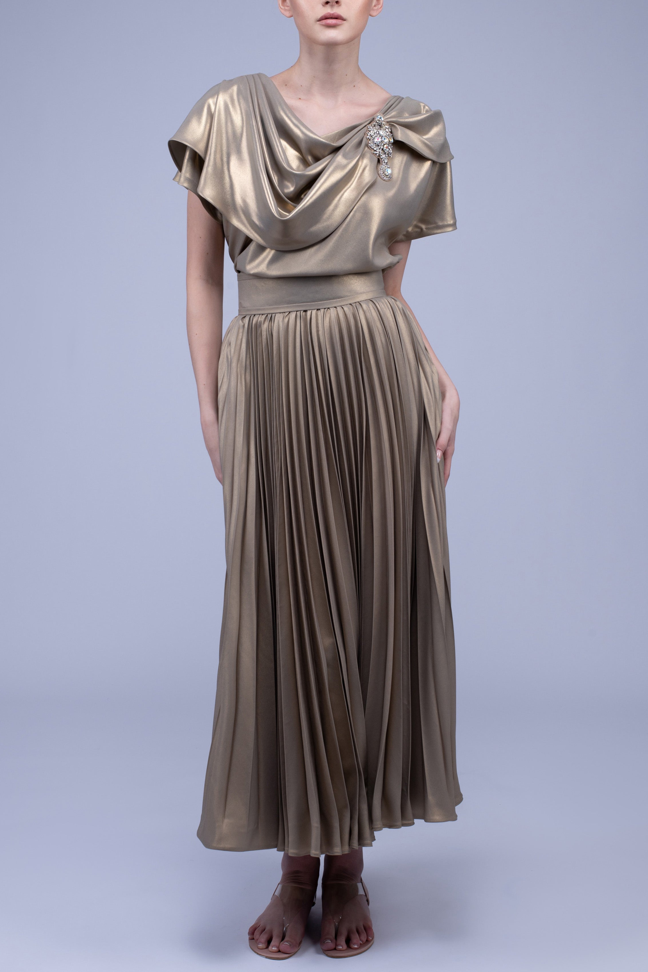 Embrace the softness of draping in this metallic lamé top that’s highlighted by the draped shoulder and secured with a crystal beads brooch. The short-sleeve piece is secured with a back zipper. Pair it with the matching skirt for an effortlessly stylish look.