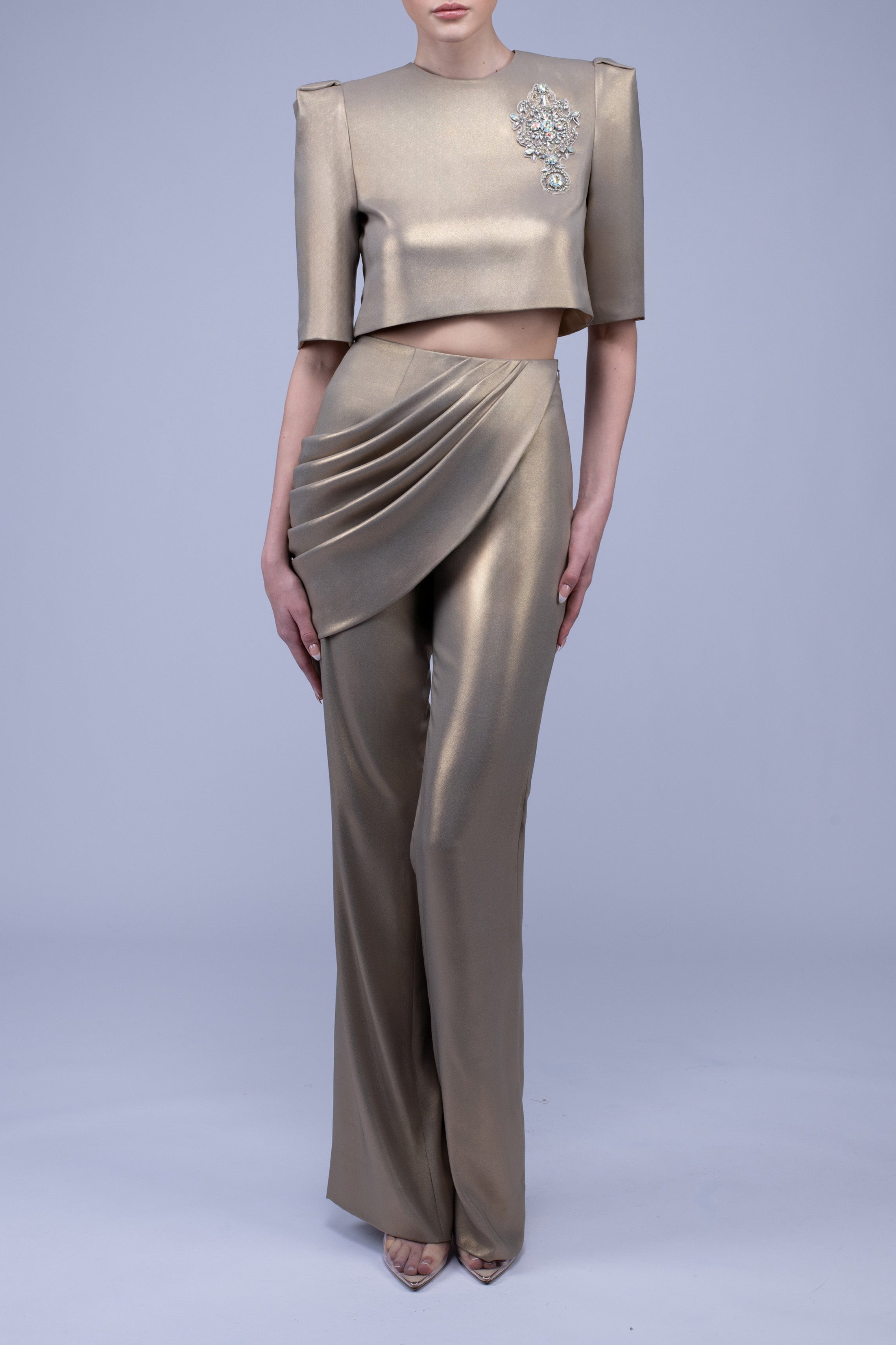 Spotlighted by our signature square shoulders and the cropped length, this metallic lamé top is a versatile piece that will elevate any outfit. It features a round neck and is elevated with a crystal-bead brooch.